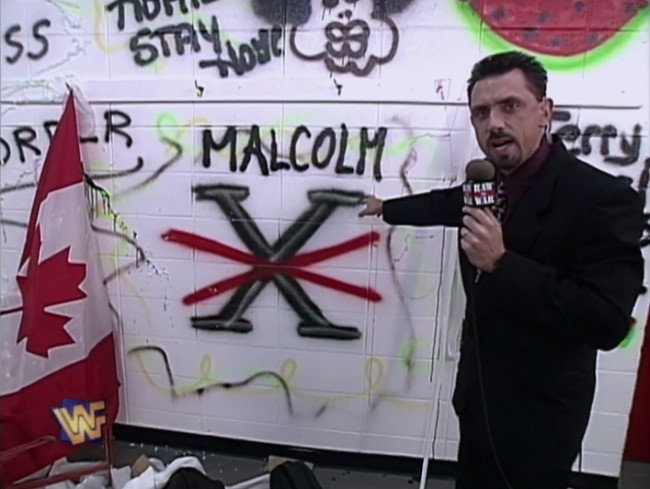 The prelude to this segment is that the week before on Raw, The Nation’s locker room was trashed with racist remarks graffitied all over the walls. A “Canada Rules” tagging leads people to suspect that The Hart Foundation is involved. However, there’s also a “Malcolm X” tagging with an “X” that looks suspiciously like the DX logo.
