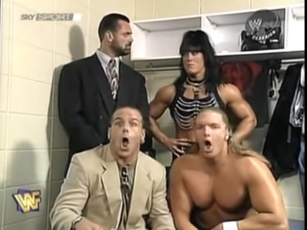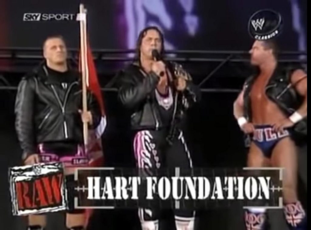 HHH drops the major bombshell, claiming that he heard The Hart Foundation use the N-word while they were vandalizing The Nation’s locker room. The Nation rush the stage and beat up The Hart Foundation, bafflingly taking Triple H and Shawn Michaels of all people at face value.